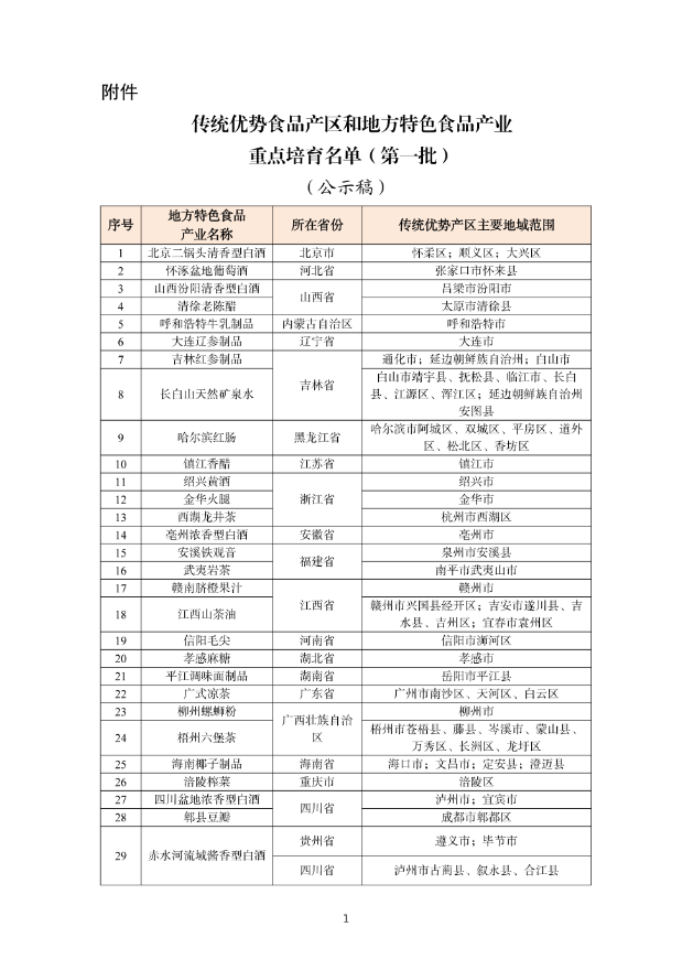 工業和信息化部發布第一批傳統優勢食品產區和地方特色食品產業重點培育名單,包括云南小粒咖啡、西湖龍井茶等39個重點培育對象,涵蓋乳制品制造、飲料制造、釀酒工業、精制茶制造等食品工業主要門類,分布于我國28個省、自治區、直轄市和新疆生產建設兵團。